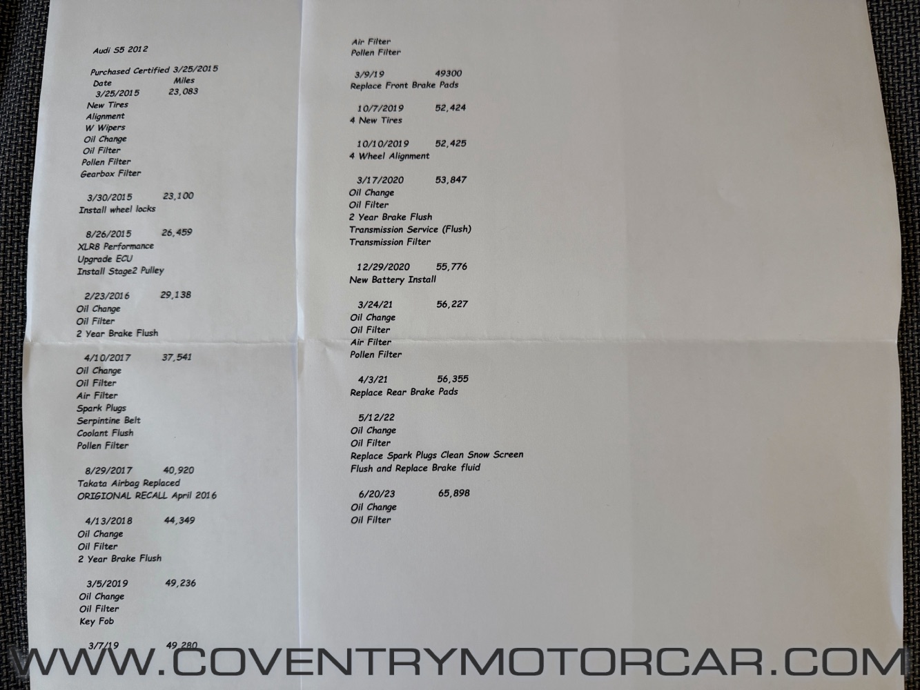 JUST INTO INVENTORY IS THIS 2012 AUDI S5 3.0T PRESTIGE CONVERTIBLE, A WELL-CARED-FOR, ENTHUSIAST-FRIENDLY EXAMPLE THAT COMBINES OPEN-TOP DRIVING WITH LEGENDARY AUDI PERFORMANCE AND ALL-WEATHER CAPABILITY. FINISHED IN GLACIER WHITE METALLIC WITH A BLACK SOFT TOP OVER A BLACK LEATHER INTERIOR, THIS S5 IS POWERED BY THE SUPERCHARGED 3.0L V6, DELIVERING STRONG, LINEAR POWER THROUGH QUATTRO ALL-WHEEL DRIVE FOR CONFIDENT PERFORMANCE IN ANY CONDITIONS. THIS IS A TWO-OWNER VEHICLE, WITH THE SECOND OWNER PURCHASING THE CAR IN 2015 AND MAINTAINING IT DILIGENTLY, COMPLETE WITH A DETAILED SERVICE RECORD SUMMARY INCLUDED WITH THE VEHICLE. DESIRABLE FACTORY OPTIONS INCLUDE THE AUDI SPORT DIFFERENTIAL FOR SHARPER HANDLING AND IMPROVED CORNER EXIT, BANG & OLUFSEN PREMIUM AUDIO, MMI NAVIGATION, BACKUP CAMERA, AND FULL PRESTIGE PACKAGE AMENITIES. FOR THE ENTHUSIAST SEEKING A REFINED YET ENGAGING AWD CONVERTIBLE THAT CAN BE ENJOYED YEAR-ROUND, THIS S5 CHECKS ALL THE RIGHT BOXES. PLEASE CONTACT US FOR MORE DETAILS OR TO SCHEDULE A TEST DRIVE.