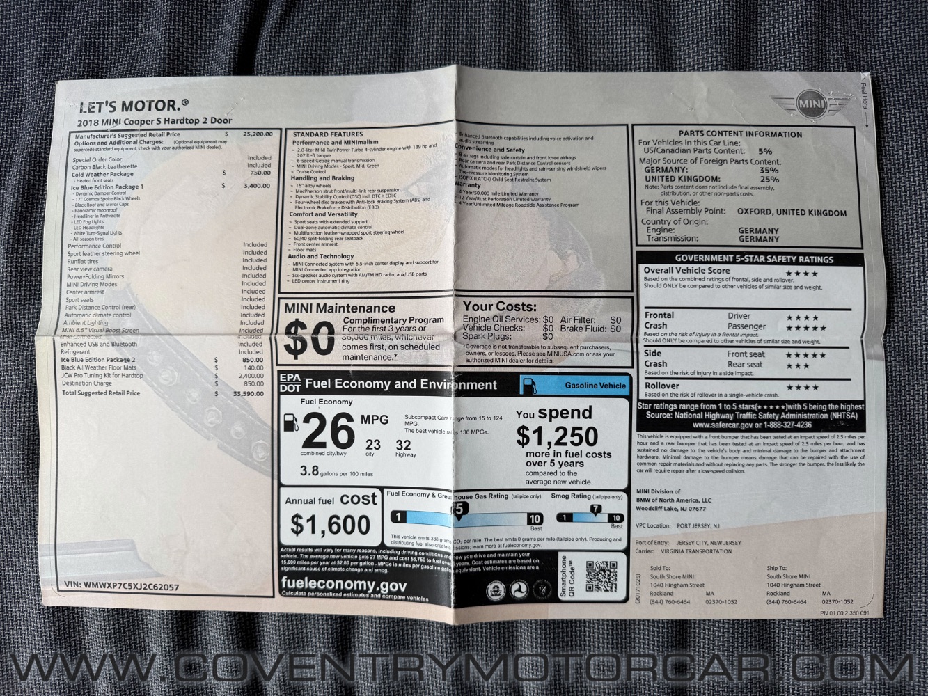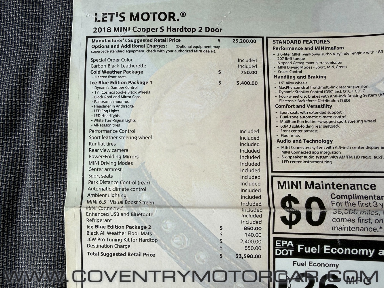 OFFERED FOR SALE IS THIS HIGHLY UNIQUE 2018 MINI COOPER ICE BLUE EDITION PACKAGE 2, EQUIPPED WITH THE ENTHUSIAST-PREFERRED 6-SPEED MANUAL TRANSMISSION AND FINISHED IN THE UNMISTAKABLE ICE BLUE METALLIC THAT SETS THIS CAR APART FROM STANDARD BUILDS. THIS EXAMPLE IS LOADED WITH PERFORMANCE AND DRIVER-FOCUSED OPTIONS INCLUDING DYNAMIC DAMPER CONTROL, 17-INCH COSMOS BLACK WHEELS, PANORAMIC ROOF, FOG LIGHTS, SPORT SEATS, SPORT STEERING WHEEL, 6.5-INCH BOOST SCREEN, AND THE SOUGHT-AFTER JOHN COOPER WORKS PRO TUNING KIT FOR ADDED CHARACTER AND PERFORMANCE. TRUE TO THE SPIRITED NATURE OF MINI, THIS CAR DELIVERS SHARP HANDLING AND AN ENGAGING DRIVING EXPERIENCE THAT MODERN HOT HATCH ENTHUSIASTS APPRECIATE. INCLUDED WITH THE VEHICLE ARE BOTH SUMMER AND WINTER TIRE SETS, ORIGINAL OWNER’S MANUALS, TWO KEYS, A CAR COVER, AND THE ORIGINAL WINDOW STICKER – MAKING IT THE COMPLETE PACKAGE. PLEASE CONTACT US FOR MORE INFORMATION OR TO SCHEDULE A TEST DRIVE.