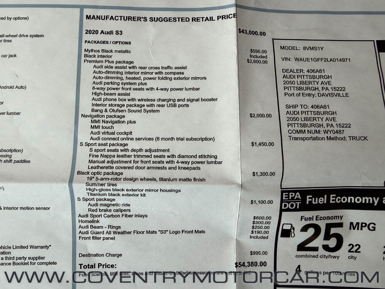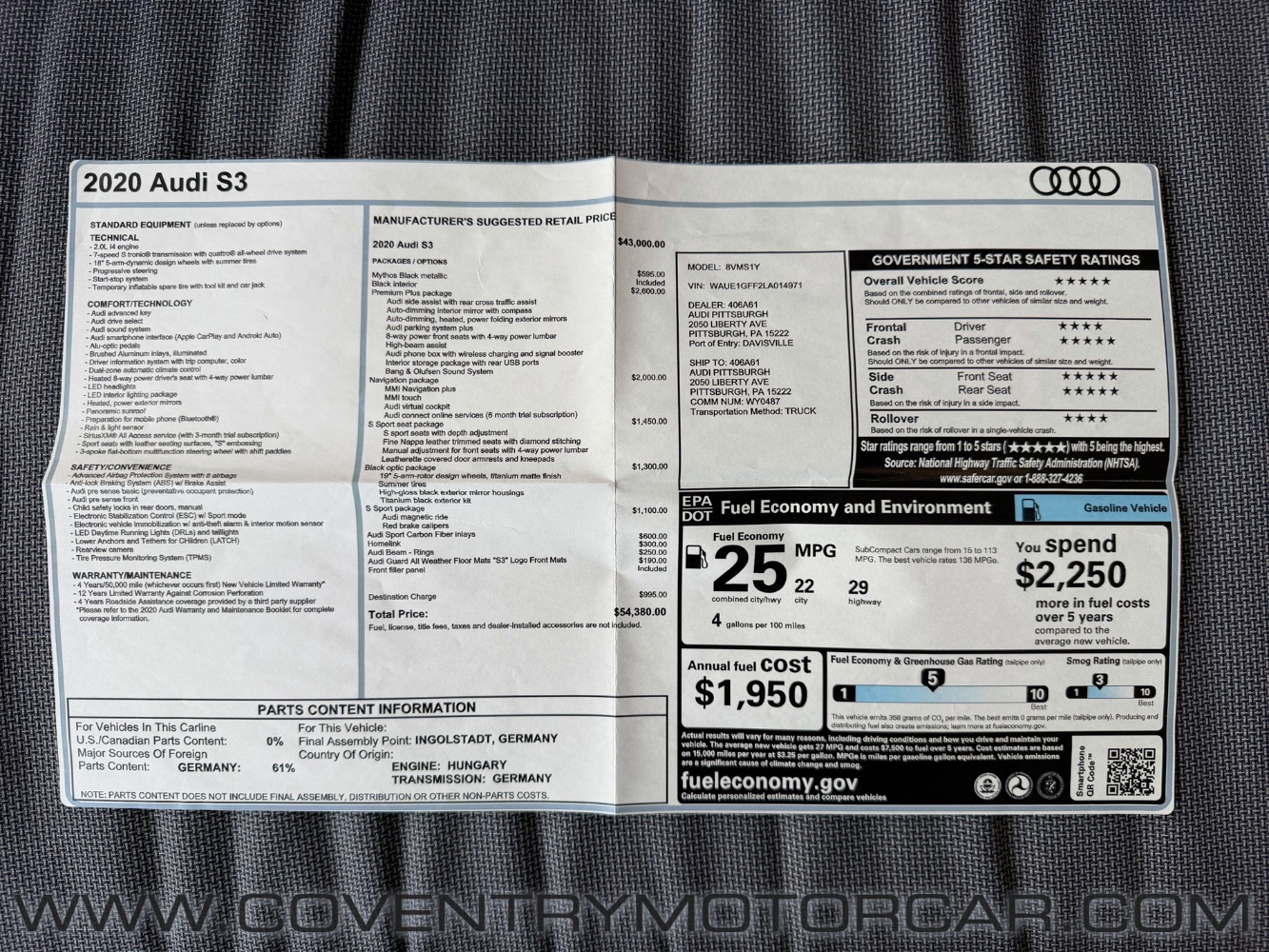 OFFERED FOR SALE IS THIS HIGH-PERFORMANCE 2020 AUDI S3, METICULOUSLY MAINTAINED AT AUDI BY BOTH OF ITS OWNERS. BUILT FOR DRIVING ENTHUSIASTS, IT FEATURES THE S SPORT PACKAGE WITH AUDI MAGNETIC RIDE, RED BRAKE CALIPERS, S SPORT SEATS, AND AUDI SPORT CARBON FIBER TRIM FOR AN AGGRESSIVE, TRACK-READY PRESENCE. THE PREMIUM PLUS PACKAGE ADDS AUDI SIDE ASSIST, PARKING PLUS, HIGH-BEAM ASSIST, WIRELESS CHARGING, AND THE PREMIUM BANG & OLUFSEN AUDIO SYSTEM, WHILE THE NAVIGATION PACKAGE WITH MMI TOUCH, NAVIGATION PLUS, AND VIRTUAL COCKPIT KEEPS YOU FULLY CONNECTED ON THE ROAD. THIS S3 ALSO INCLUDES AUDI BEAM RINGS, S3 LOGO FLOOR MATS, FULL MANUALS, ONE KEY, AND THE ORIGINAL WINDOW STICKER. WITH ITS PRECISION HANDLING, SPORTY UPGRADES, AND PERFORMANCE-FOCUSED FEATURES, THIS S3 IS READY TO THRILL ANY DRIVER – CONTACT US TODAY TO SCHEDULE A TEST DRIVE.
