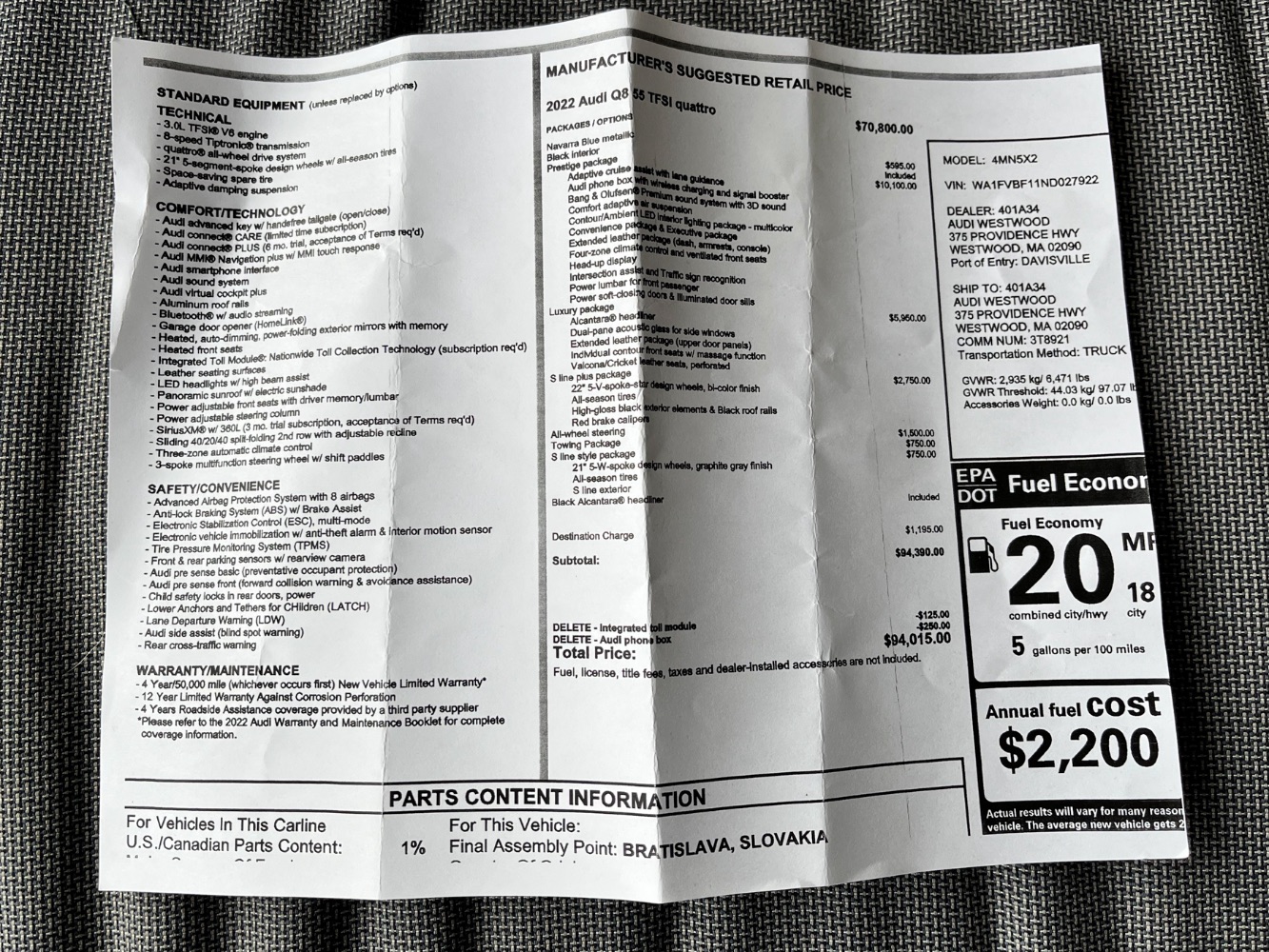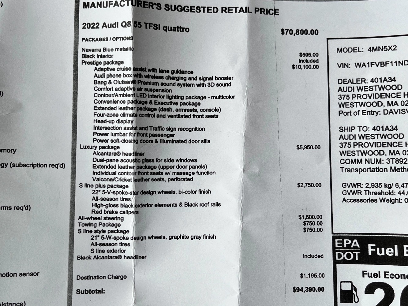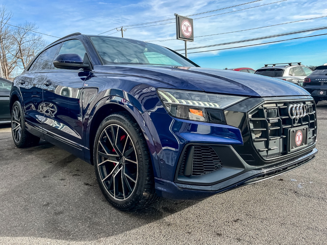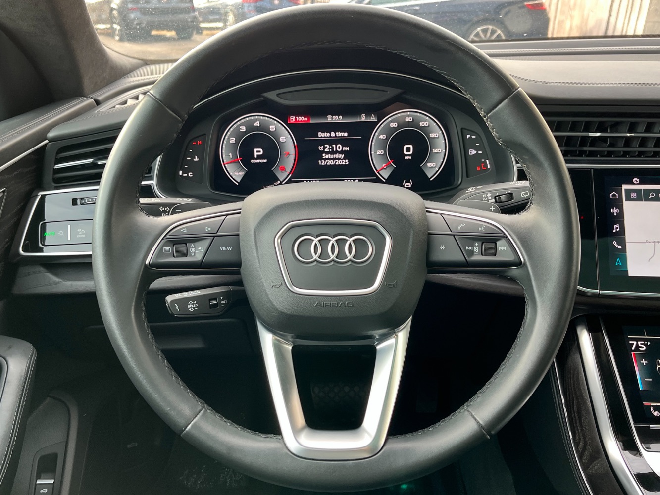 OFFERED FOR SALE IS THIS EXCEPTIONAL, ONE-OWNER 2022 AUDI Q8 PRESTIGE 55 TFSI WITH A STRONG CARFAX SERVICE HISTORY, HIGHLIGHTED BY A RECENT WATER PUMP REPLACEMENT FOR ADDED CONFIDENCE. THIS Q8 IS HEAVILY OPTIONED AND REPRESENTS THE HIGHEST LEVEL OF AUDI LUXURY AND TECHNOLOGY, STARTING WITH THE PRESTIGE PACKAGE, WHICH INCLUDES ADAPTIVE CRUISE CONTROL WITH LANE GUIDANCE, HEAD-UP DISPLAY, BANG & OLUFSEN 3D PREMIUM SOUND SYSTEM, CONTOUR AMBIENT LED INTERIOR LIGHTING, EXTENDED LEATHER PACKAGE, AND A FULL SUITE OF ADVANCED DRIVER ASSISTANCE FEATURES. THE EXECUTIVE AND CONVENIENCE PACKAGES FURTHER ENHANCE COMFORT WITH UPGRADED SEATING, PREMIUM MATERIALS, AND INTELLIGENT ACCESS FEATURES, WHILE ADAPTIVE AIR SUSPENSION DELIVERS AN EXCEPTIONAL RIDE QUALITY WITH ADJUSTABLE DRIVE MODES. ADDITIONAL HIGHLIGHTS INCLUDE THE S LINE PLUS PACKAGE AND THE HIGHLY DESIRABLE ALL-WHEEL STEERING, PROVIDING IMPROVED HANDLING AND MANEUVERABILITY RARELY FOUND ON THE Q8. THIS IS A BEAUTIFULLY SPECIFIED FLAGSHIP AUDI SUV THAT BLENDS PERFORMANCE, CUTTING-EDGE TECHNOLOGY, AND TOP-TIER LUXURY IN ONE COMPELLING PACKAGE.