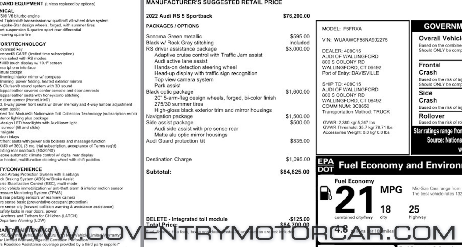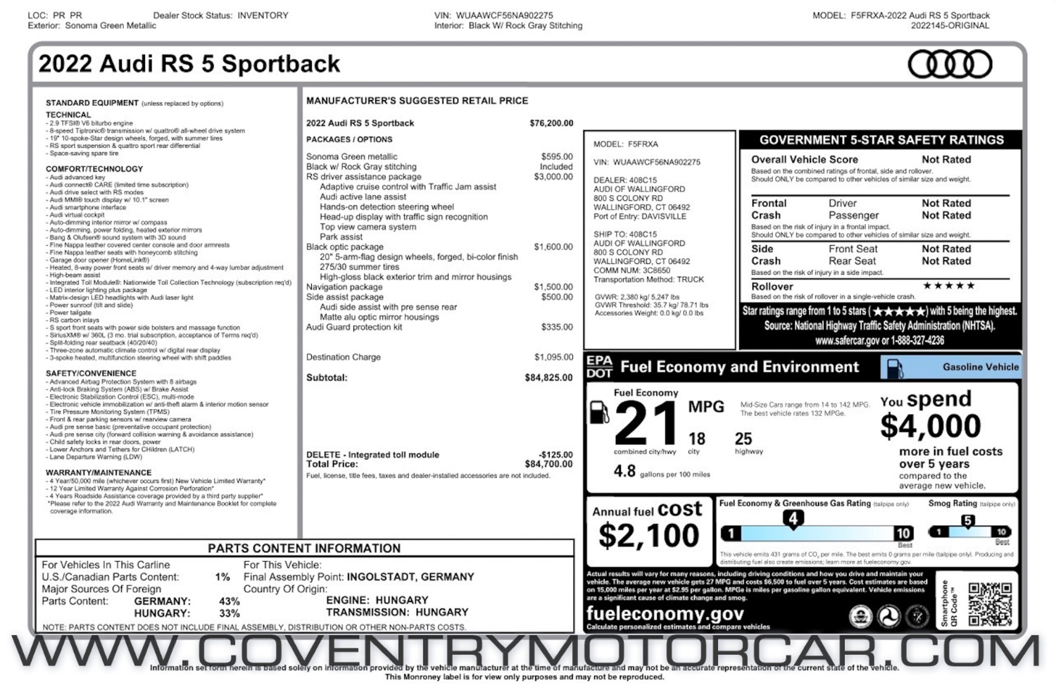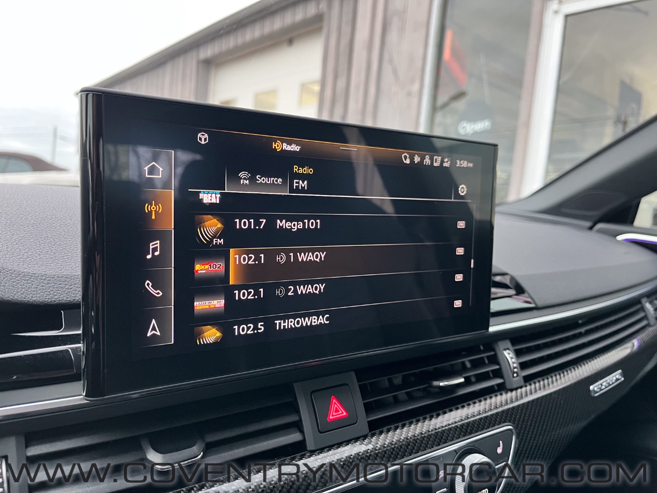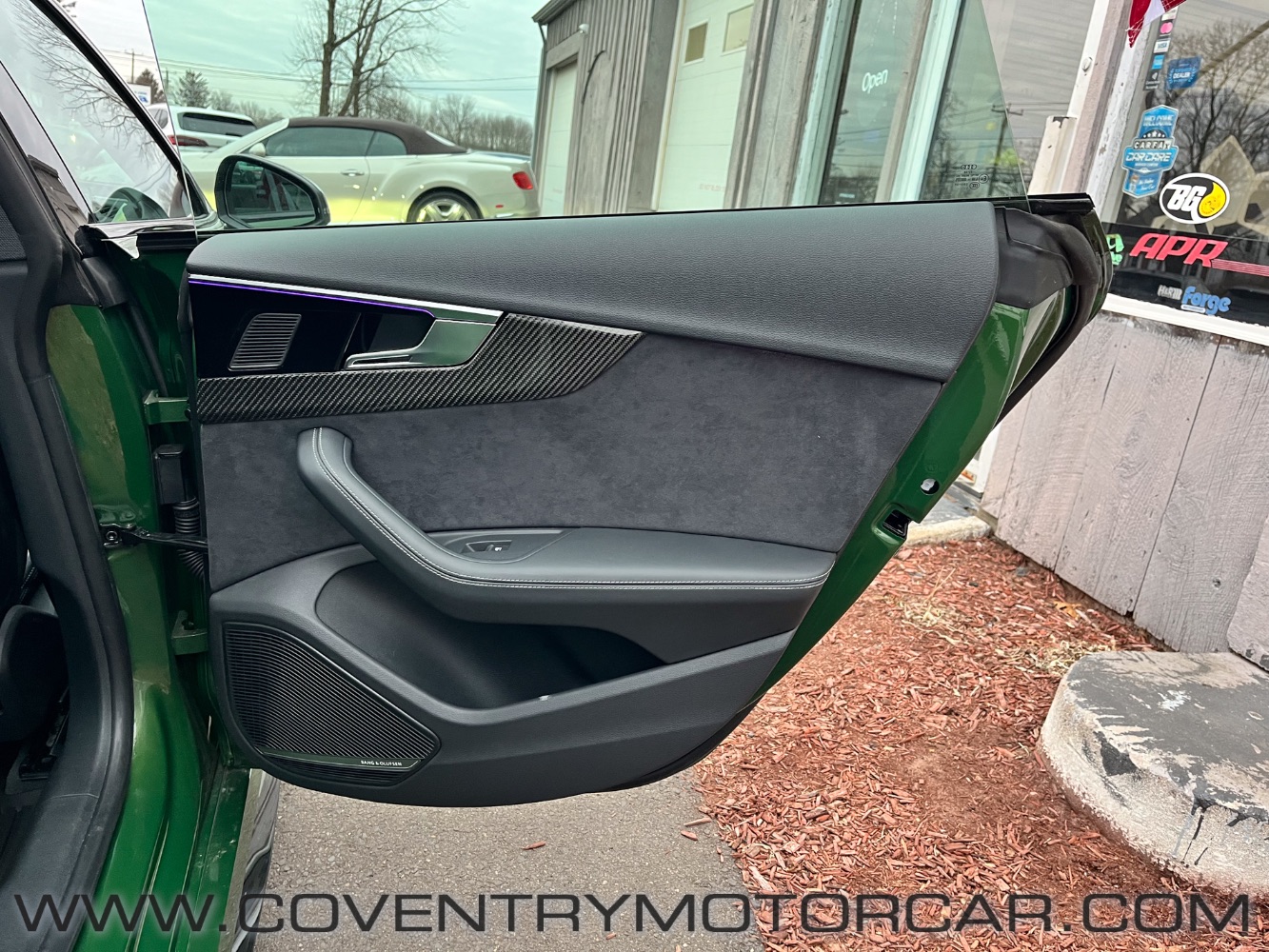 JUST IN IS THIS STUNNING ONE-OWNER RS5 SPORTBACK FINISHED IN RARE SONOMA GREEN METALLIC OVER BLACK LEATHER WITH ROCK GRAY CONTRAST STITCHING, SHOWING JUST UNDER 14,000 MILES. THIS EXCEPTIONALLY CLEAN, ENTHUSIAST-OWNED EXAMPLE IS LOADED WITH HIGH-SPEC DRIVER AND PERFORMANCE OPTIONS INCLUDING ADAPTIVE CRUISE CONTROL WITH ACTIVE LANE ASSIST AND HANDS-ON STEERING WHEEL DETECTION, HEAD-UP DISPLAY, SURROUND VIEW CAMERA WITH PARK ASSIST, BLACK OPTIC PACKAGE, NAVIGATION, SIDE ASSIST, REAR CROSS TRAFFIC ASSIST, AND MATTE ALUMINUM OPTIC MIRROR HOUSINGS. THE RS5 SPORTBACK DELIVERS EVERYDAY USABILITY WITH SUPERCAR-LEVEL PERFORMANCE, QUATTRO CONFIDENCE, AND UNMISTAKABLE PRESENCE IN THIS STANDOUT COLOR COMBINATION. PLEASE CONTACT US FOR MORE INFORMATION OR TO SCHEDULE A TEST DRIVE.
