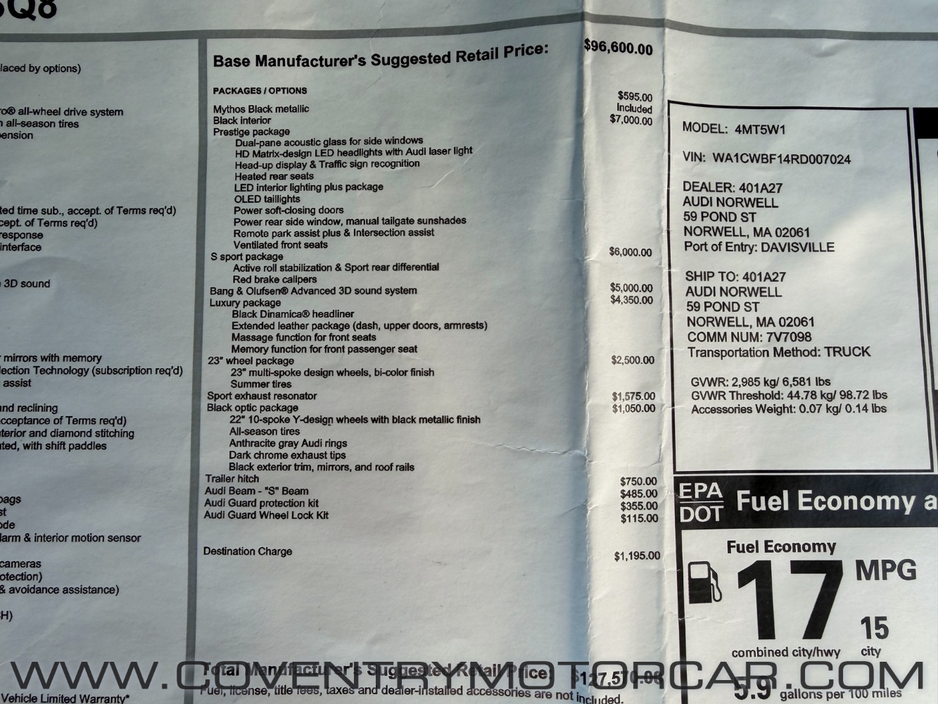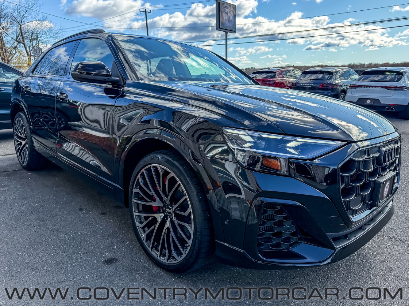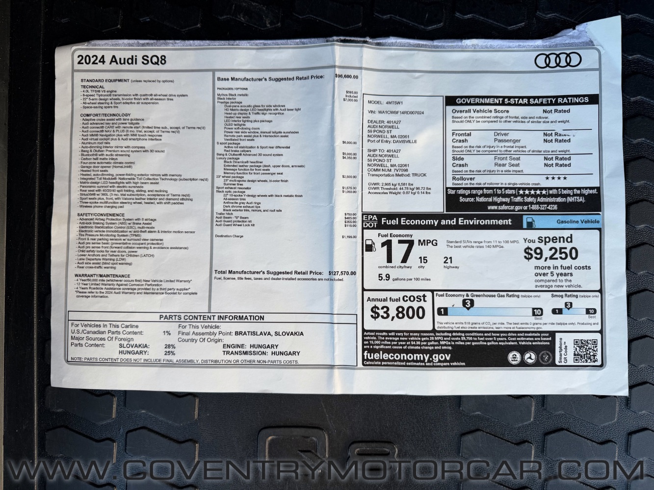 JUST IN: A STUNNING 2024 AUDI SQ8 FINISHED IN MYTHOS BLACK METALLIC OVER LUXURIOUS BLACK LEATHER, FULLY EQUIPPED WITH THE HIGHLY DESIRABLE PRESTIGE PACKAGE. THIS SQ8 IS LOADED WITH PREMIUM OPTIONS, INCLUDING THE S SPORT PACKAGE WITH RED BRAKE CALIPERS, ACTIVE ROLL STABILIZATION, AND A REAR SPORT DIFFERENTIAL; THE BANG & OLUFSEN ADVANCED 3D SOUND SYSTEM; AND THE LUXURY PACKAGE FEATURING EXTENDED LEATHER AND RELAXING MASSAGE SEATS. IT ALSO FEATURES STRIKING 23-INCH MULTI-SPOKE DESIGN WHEELS, THE AUDI SPORT EXHAUST, BLACK OPTICS PACKAGE, TRAILER HITCH, AND AUDI S BEAM LIGHTING. METICULOUSLY CARED FOR AND OFFERED WITH BOTH KEYS, MANUALS, AND THE ORIGINAL WINDOW STICKER, THIS EXCEPTIONAL SQ8 IS READY FOR ITS NEXT ENTHUSIAST – CONTACT US TODAY FOR MORE DETAILS OR TO SCHEDULE A TEST DRIVE.